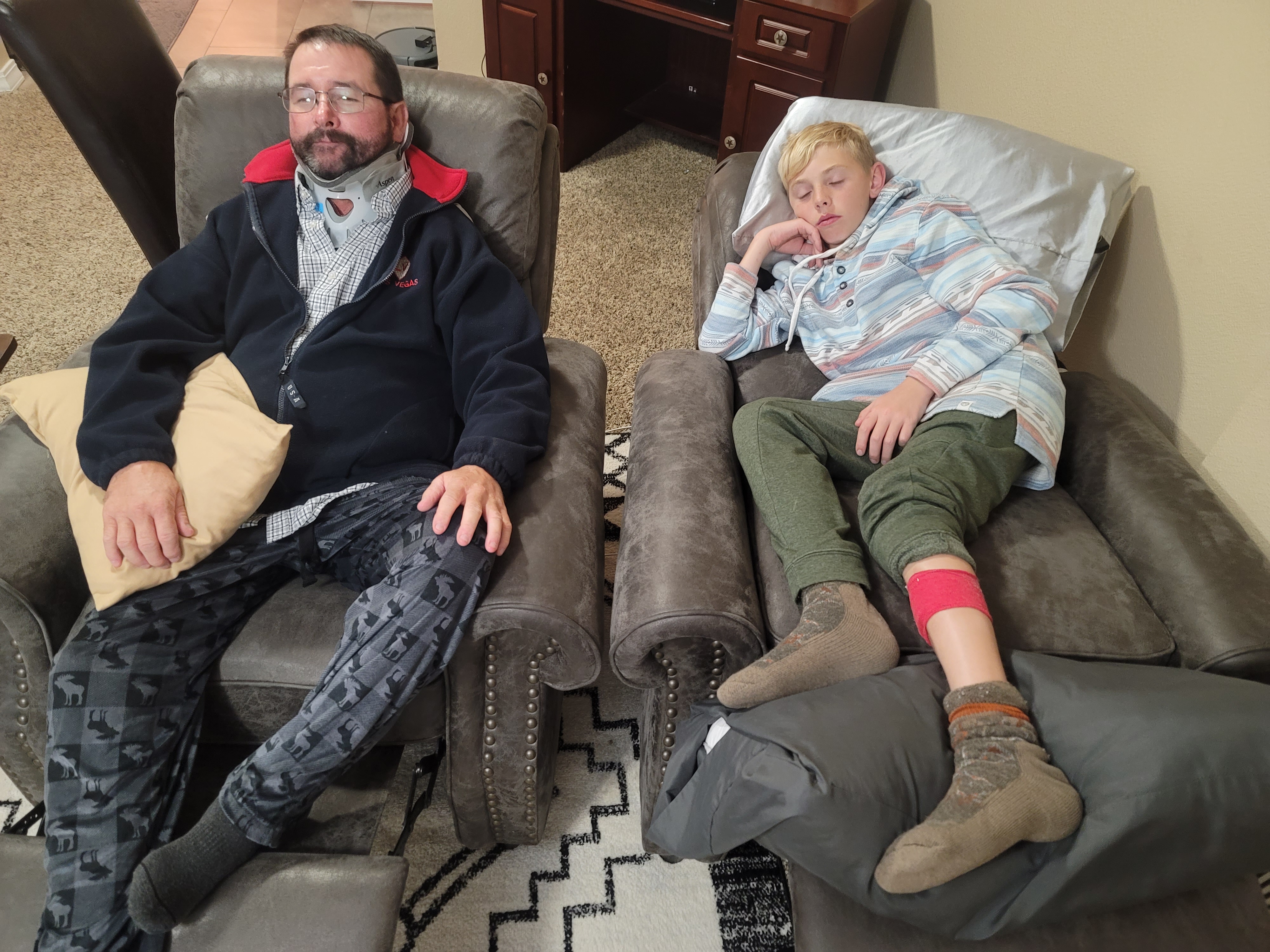 Brent was able to start Occupational Hand Therapy pretty early on to help regain strength in his hands and arms. However, physical therapy was off limits the first 3+ months. His neck hardware, as we learned at his first post-surgical follow-up visit, was high risk for failure (he just had a lot going on and a lot of hardware), so he had CT scans about every 3-4 weeks those first few months and was told to not do too much physically to allow time for the hardware to properly fuse and heal. He was also restricted from lifting more than 8 lbs. Brent followed doctors orders exactly, and was the most obedient patient for the first time in his life! He kind of had to be. But for a guy that went from non-stop, "on the go," never sat still, and loved to work (he had been called a "workaholic" a time or two) to 12 weeks of resting, healing, and a sedentary lifestyle was tough. This has not only been a physical test, but mentally as well. One day, I got out of the shower and Brent had found a buddy. Our Halloween skeleton was sitting in the recliner next to him. Clearly, he was feeling bored and lonely and I needed to reevaluate and spend some time with him. Brent also learned some new skills- he was introduced to Netflix and became hooked on his first series, Cobra Kai. Those who know Brent, know he doesn't typically sit still long enough to watch much TV. He's a "sun up to sun down" kind of guy! The kids also tried to teach him about Minecraft.
